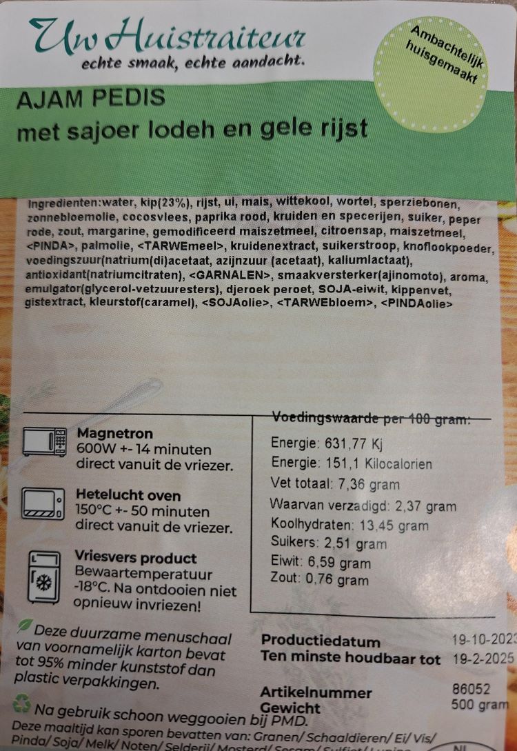 Op het etiket worden allereerst de gebruikte ingrediënten achter elkaar opgesomd. Verder treft u de productiedatum aan en ook is de tht-datum op het etiket vermeld, oftwel de "ten minste houdbaar tot-datum". Zoals u begrijpt zal uw eigen maaltijd op een andere dag bereid worden en zal de 'tht-datum' ook anders zijn. Na bezorging is uw maaltijd minimaal 6 maanden houdbaar. Klik op het etiket om deze te vergroten.