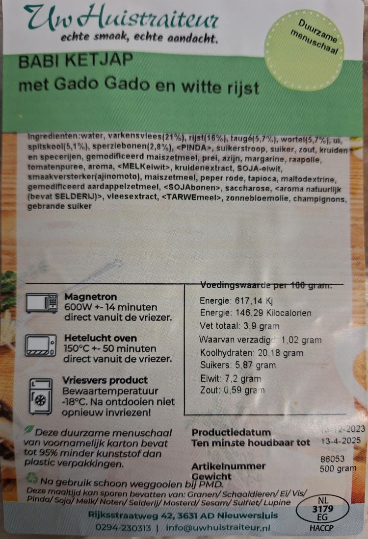 Op het etiket worden allereerst de gebruikte ingrediënten achter elkaar opgesomd. Verder treft u de productiedatum aan en ook is de tht-datum op het etiket vermeld, oftwel de "ten minste houdbaar tot-datum". Zoals u begrijpt zal uw eigen maaltijd op een andere dag bereid worden en zal de 'tht-datum' ook anders zijn. Na bezorging is uw maaltijd minimaal 6 maanden houdbaar. Klik op het etiket om deze te vergroten.