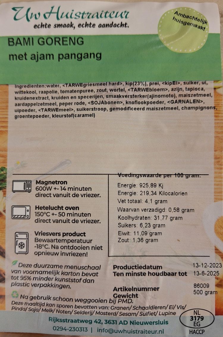 Op het etiket worden allereerst de gebruikte ingrediënten achter elkaar opgesomd. Verder treft u de productiedatum aan en ook is de tht-datum op het etiket vermeld, oftwel de "ten minste houdbaar tot-datum". Zoals u begrijpt zal uw eigen maaltijd op een andere dag bereid worden en zal de 'tht-datum' ook anders zijn. Na bezorging is uw maaltijd minimaal 6 maanden houdbaar. Klik op het etiket om deze te vergroten.