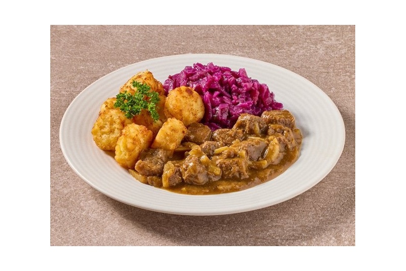 Rode kool met appel 34% (rode kool, water, appelmoes (appelen, zuurteregelaar: citroenzuur, antioxidant: ascorbinezuur), appelsap uit sapconcentraat, appelen, suiker, gemodificeerd zetmeel, koolzaadolie, citroensap, champignon extract (champignonsapconcentraat, maltodextrine), laurier, specerijen), rösti 24% (aardappelen, palmolie, zout, dextrose, uienpoeder, emulgator: hydroxypropylmethylcellulose, peper), water, rundstoofvlees 10% (rundvlees, water, zetmeel, zout), uien, bruin bier 4% (water, GERSTEMOUT, maïs, fructosestroop, gebrande suiker, hop), pulled beef 4% (rundsvlees, zout), peperkoek (glucose-fructosestroop, ROGGEbloem, ROGGEzemelen, rijsmiddelen: natriumwaterstofcarbonaat, dinatriumdifosfaat, specerijen en aroma), plantaardige oliën (zonnebloem, koolzaad, in wisselende verhoudingen), gemodificeerd zetmeel, TARWEbloem, rundvleesextract (rundvlees, zout), bouillon (groente-extracten (wortelen, uien, bloemkool, tomaten, champignons), zout, plantaardige olie (zonnebloem, koolzaad), suiker, zetmeel, kruiden, specerij-extract, specerijen, lavas, knoflook), knoflook, kleurstof: karamel, kruiden, peper.