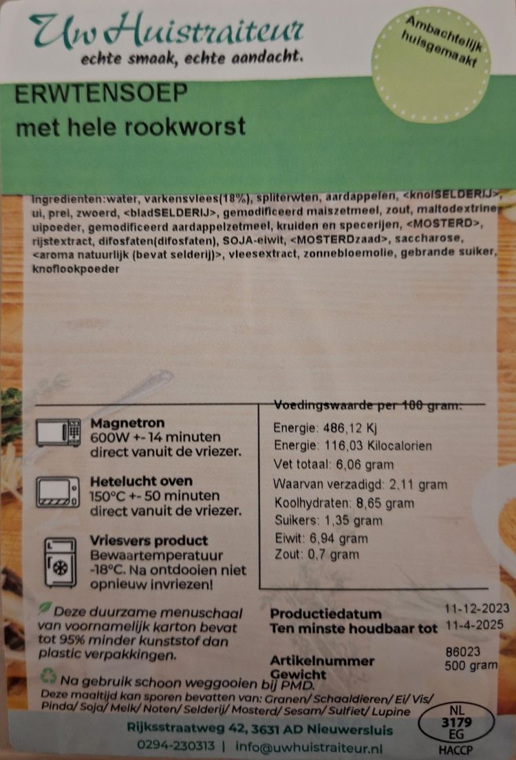 Op het etiket worden allereerst de gebruikte ingrediënten achter elkaar opgesomd. Verder treft u de productiedatum aan en ook is de tht-datum op het etiket vermeld, oftwel de "ten minste houdbaar tot-datum". Zoals u begrijpt zal uw eigen maaltijd op een andere dag bereid worden en zal de 'tht-datum' ook anders zijn. Na bezorging is uw maaltijd minimaal 6 maanden houdbaar. Klik op het etiket om deze te vergroten.