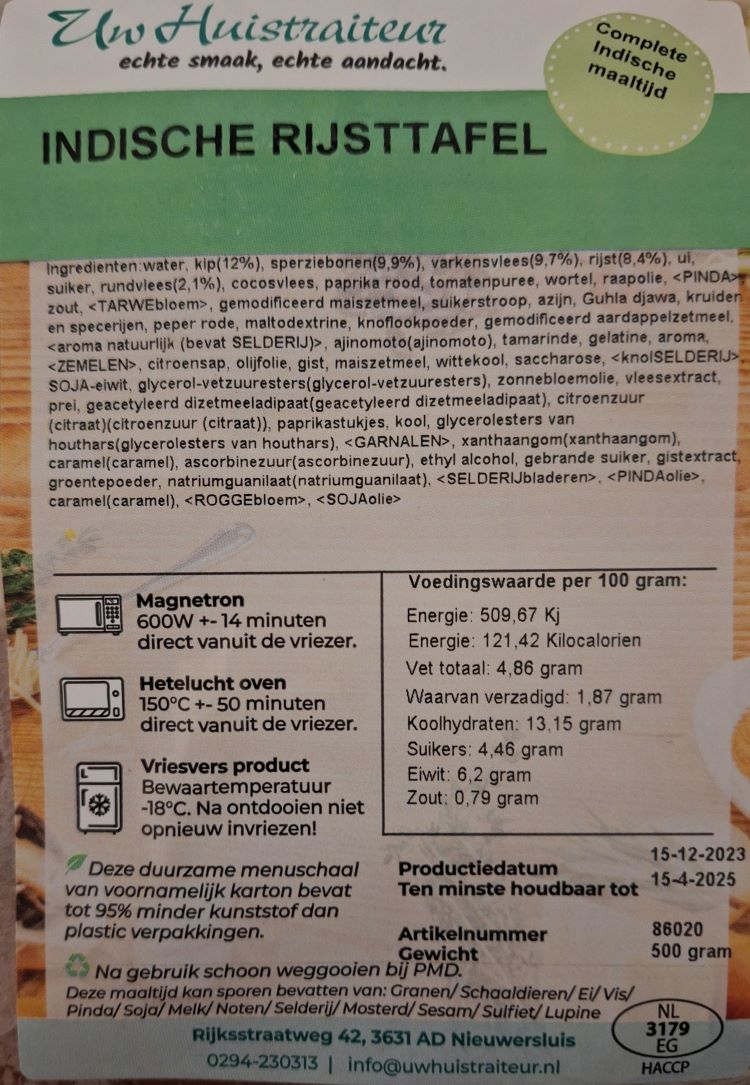 Op het etiket worden allereerst de gebruikte ingrediënten achter elkaar opgesomd. Verder treft u de productiedatum aan en ook is de tht-datum op het etiket vermeld, oftwel de "ten minste houdbaar tot-datum". Zoals u begrijpt zal uw eigen maaltijd op een andere dag bereid worden en zal de 'tht-datum' ook anders zijn. Na bezorging is uw maaltijd minimaal 6 maanden houdbaar. Klik op het etiket om deze te vergroten.