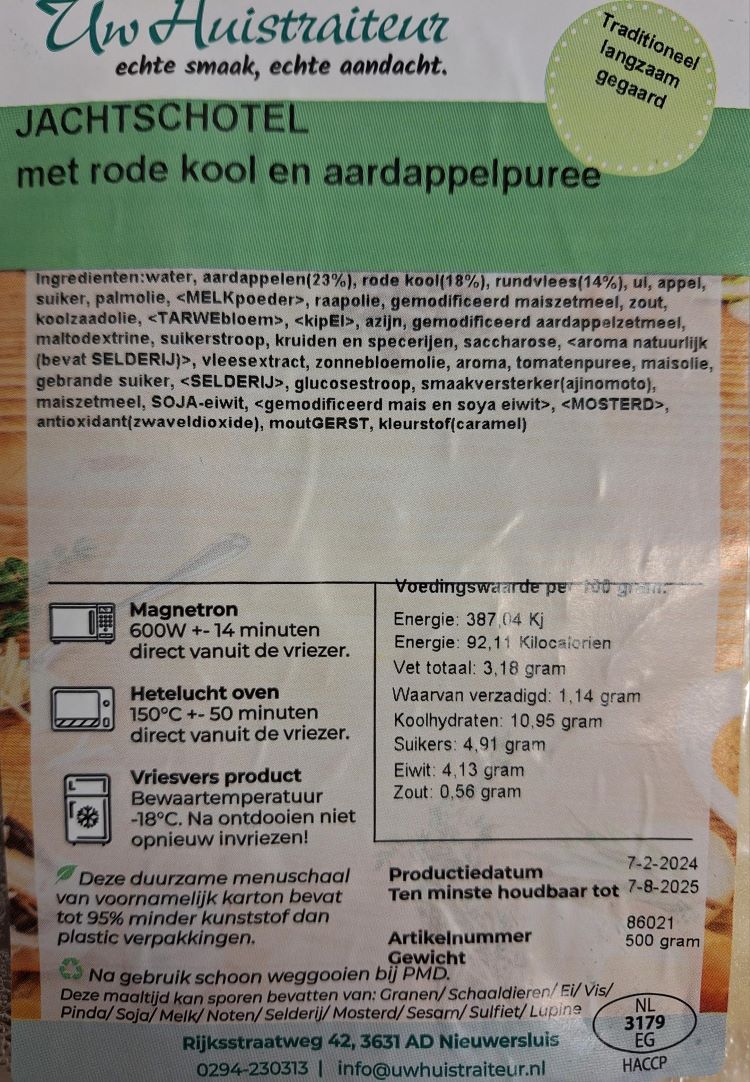 Op het etiket worden allereerst de gebruikte ingrediënten achter elkaar opgesomd. Verder treft u de productiedatum aan en ook is de tht-datum op het etiket vermeld, oftwel de "ten minste houdbaar tot-datum". Zoals u begrijpt zal uw eigen maaltijd op een andere dag bereid worden en zal de 'tht-datum' ook anders zijn. Na bezorging is uw maaltijd minimaal 6 maanden houdbaar. Klik op het etiket om deze te vergroten.