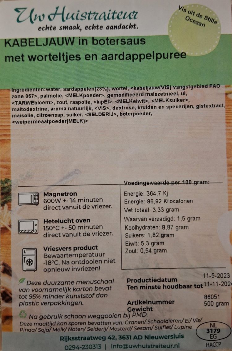 Op het etiket worden allereerst de gebruikte ingrediënten achter elkaar opgesomd. Verder treft u de productiedatum aan en ook is de tht-datum op het etiket vermeld, oftwel de "ten minste houdbaar tot-datum". Zoals u begrijpt zal uw eigen maaltijd op een andere dag bereid worden en zal de 'tht-datum' ook anders zijn. Na bezorging is uw maaltijd minimaal 6 maanden houdbaar. Klik op het etiket om deze te vergroten.