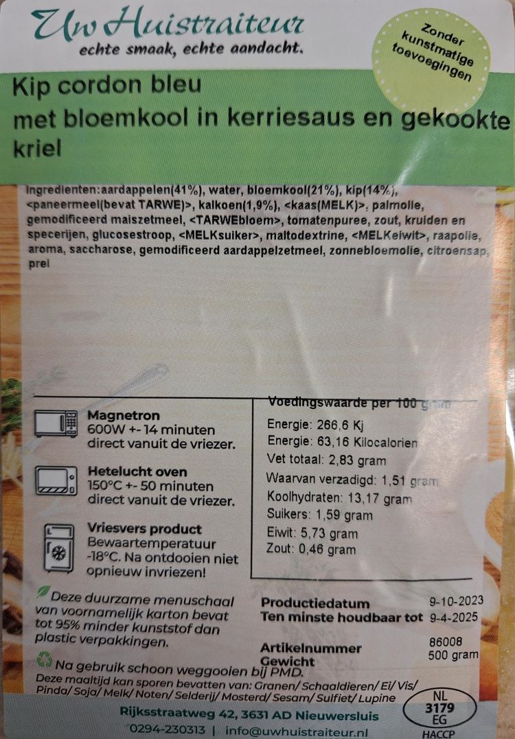 Elke maaltijd is voorzien van een duidelijk etiket waarop u allerlei informatie aantreft over de maaltijd. Hieronder treft u een voorbeeld-etiket aan van dit gerecht. Als u op de afbeelding van het etiket klikt, wordt de afbeelding vergroot en kunt u alle informatie over dit gerecht zelf vinden.