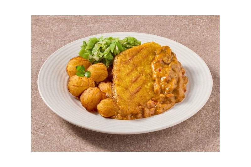 Bonen 28%, aardappelnootjes 25% (aardappelen, zonnebloemolie, zout, dextrose, emulgatoren: hydroxypropylmethylcellulose, peper), kipfilet gepaneerd 20% (kipfilet, plantaardige oliën (zonnebloem, koolzaad), paneermeel (TARWE), zetmeel, TARWEbloem, zout, TARWEzetmeel, maltodextrine, bamboevezel, maïsbloem, TARWEgluten, verdikkingsmiddel: xanthaangom, gist, kleurstof: curcumine), suiker, moutextract (GERST)), water, champignons 6%, room (MELK), rode paprika, sjalotten, uien, tomatenconcentraat, plantaardige oliën (zonnebloem, koolzaad, in wisselende verhoudingen), gemodificeerd zetmeel, boter (MELK), rode wijn, rundvleesextract (rundvlees, zout), vodka, volleMELKpoeder, peterselie, champignon extract (champignonsapconcentraat, maltodextrine), zout, knoflook, specerijen.