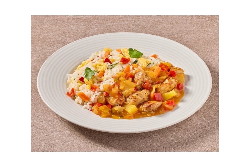Gekookte rijst 34%, groenten 33% (witte kool, rode paprika, prei, uien, wortelen, tomaten), gebakken kip 15% (kip, zout, dextrose), water, omelet (gehele EI, water, koolzaadolie, zetmeel, zout, geconcentreerd citroensap), suiker, ketchup (tomaten, azijn, suiker, zout, extracten van kruiden/specerijen (SELDERIJ), specerijen), plantaardige oliën (zonnebloem, koolzaad, in wisselende verhoudingen), ananassap uit sapconcentraat, gemodificeerd zetmeel, zout, gember, bouillon (zout, natuurlijk aroma, zetmeel, zonnebloemolie, groente-extracten (SELDERIJ, uien, tomaten, wortelen), uienpoeder, knoflook, specerijen), sojasaus (water, SOJAbonen, zout, alcoholazijn), ketjap manis (suiker, water, sojasaus (water, SOJAbonen, TARWE, zout, alcohol), zeezout, alcoholazijn, rode wijnextract), SESAMolie, rijstolie, vissaus (water, VISextract, zout, suiker, alcoholazijn), knoflook, rode chili, sambal (rode chili, zout), alcoholazijn, specerijen.