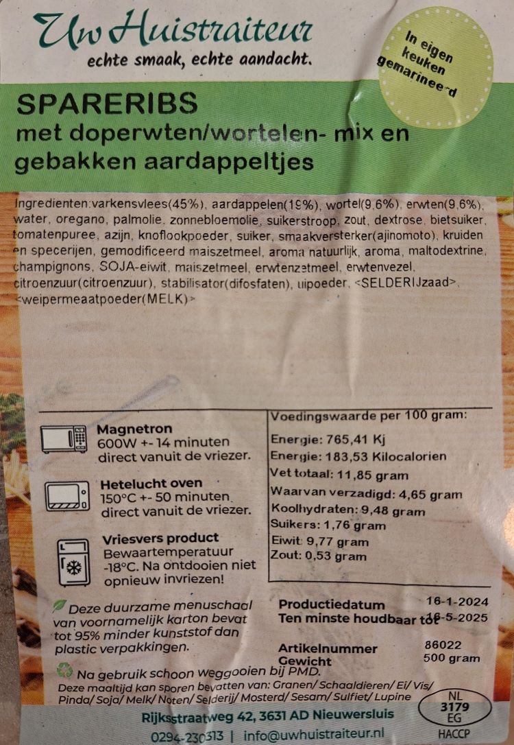 Op het etiket worden allereerst de gebruikte ingrediënten achter elkaar opgesomd. Verder treft u de productiedatum aan en ook is de tht-datum op het etiket vermeld, oftwel de "ten minste houdbaar tot-datum". Zoals u begrijpt zal uw eigen maaltijd op een andere dag bereid worden en zal de 'tht-datum' ook anders zijn. Na bezorging is uw maaltijd minimaal 6 maanden houdbaar. Klik op het etiket om deze te vergroten.