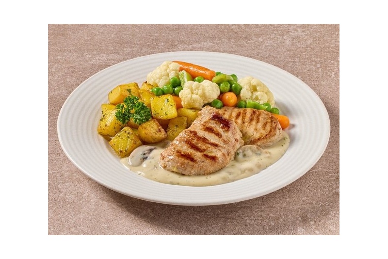 Zet in een handomdraai een lekkere, gezonde en voedzame maaltijd op tafel! De malse varkenshaas in champignonroomsaus wordt geserveerd met een groentenmix en gebakken gekruide aardappelblokjes. De maaltijd is met minder zout bereid.