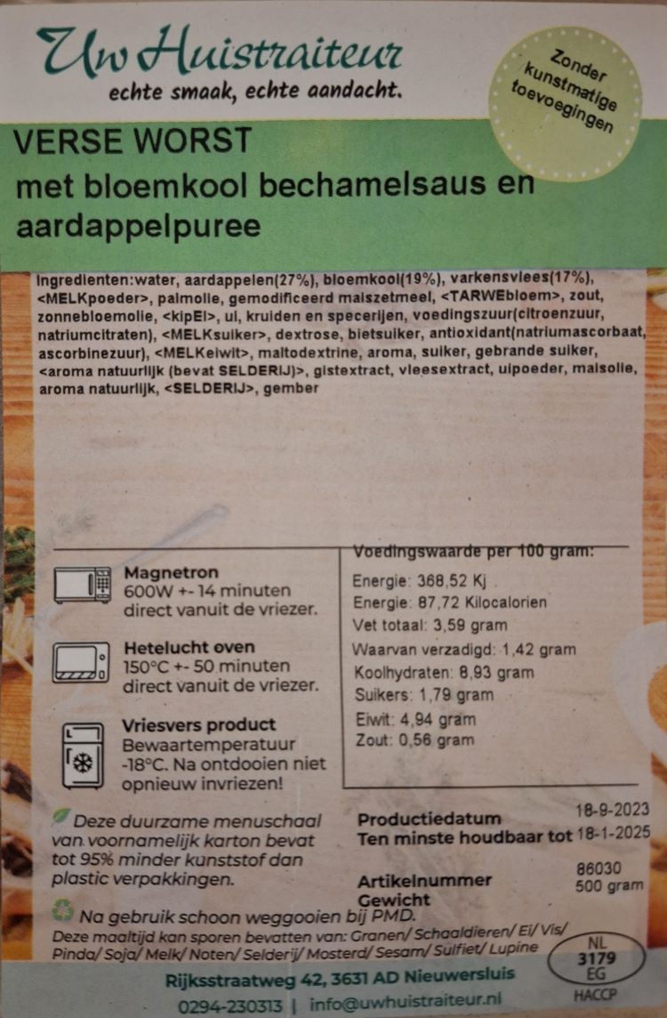 Op het etiket worden allereerst de gebruikte ingrediënten achter elkaar opgesomd. Verder treft u de productiedatum aan en ook is de tht-datum op het etiket vermeld, oftwel de "ten minste houdbaar tot-datum". Zoals u begrijpt zal uw eigen maaltijd op een andere dag bereid worden en zal de 'tht-datum' ook anders zijn. Na bezorging is uw maaltijd minimaal 6 maanden houdbaar. Klik op het etiket om deze te vergroten.