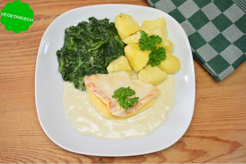Een mooie vegetarische maaltijd met een smaakvolle dubbelgevouwen omelet in een heerlijke botersaus; verfijnd en verrassend lekker. Daarbij heerlijke spinazie à la crème en lekkere Hollandse gekookte aardappelen.