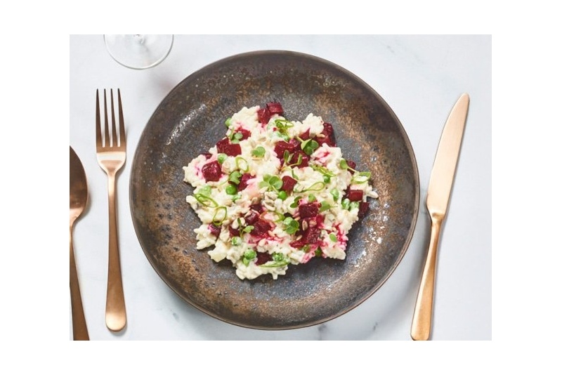 Een kleurrijk vegetarisch feestmaal waarin zachte risotto wordt gecombineerd met romige geitenkaas en de aardse smaak van rode biet. De frisse doperwten en selderij geven het gerecht een speelse balans tussen romig, fris en hartig. Ideaal voor wie tijdens de feestdagen liever geen vlees of vis eet.